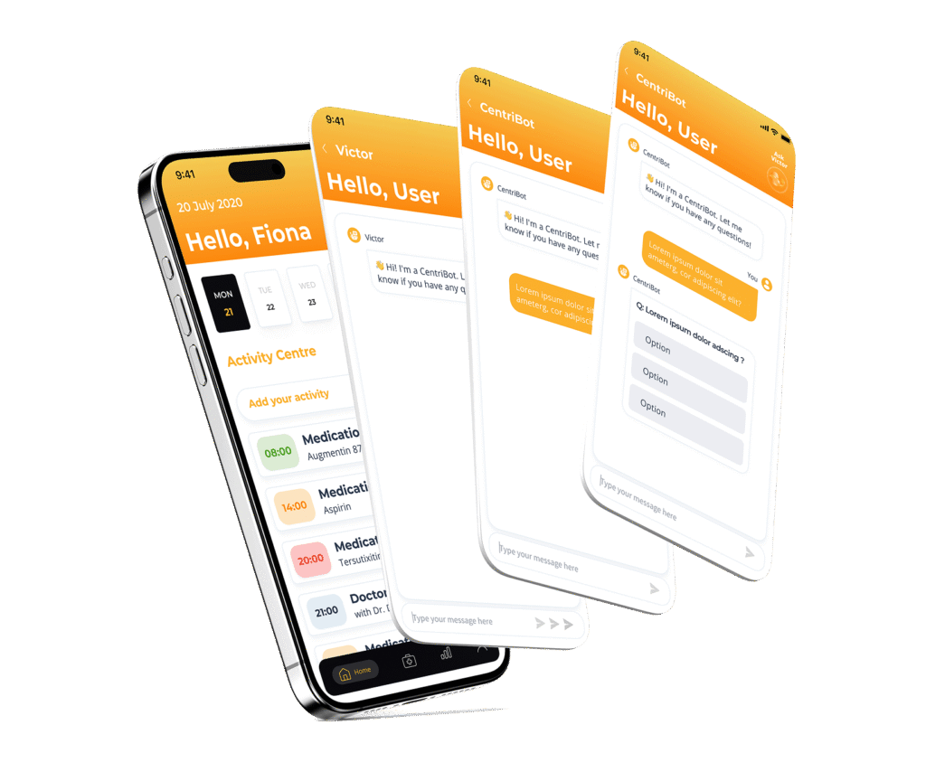The Centrefy mobile app brings healthcare management to your fingertips, offering features like daily activity tracking, medication reminders, doctor appointments, and a virtual assistant, all within a clean and easy-to-use interface.